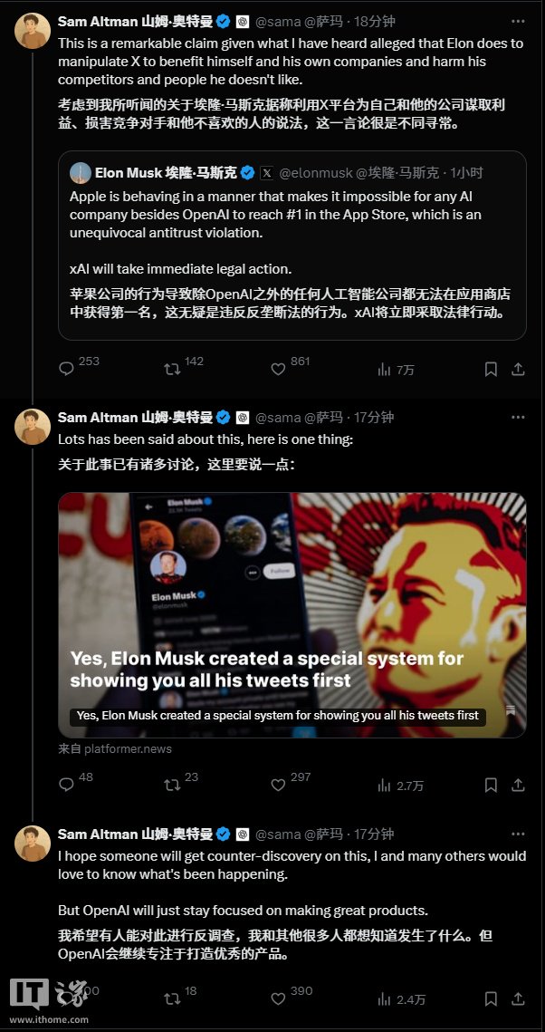 奥尔特曼迅速对马斯克的指责作出回应,他在周一晚上的 X 帖子中写道:“鉴于我听说埃隆为了操纵 X 来为自己和自己的公司谋利,损害竞争对手和他不喜欢的人,这种指控真是令人惊叹。”奥尔特曼还引用了 2023 年技术新闻网站 Platformer 的一份报告,该报告描述了马斯克在收购 Twitter(现为 X)后,对平台进行了大规模的调整,并“创建了一个系统,让你首先看到他的所有推文”。
