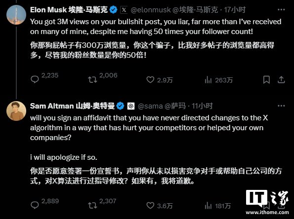 这场争吵在周二早晨仍在继续。马斯克在 X 上指责奥尔特曼,称“你这个骗子,你的胡说八道帖子的浏览量有 300 万次,比我的很多帖子浏览量都高,尽管我的粉丝数量是你的 50 倍。”奥尔特曼又回复道:“你能签署一份宣誓书,证明你从未要求 X 工程师修改算法进行任何损害竞争对手或帮助你自己公司的做法吗?如果能,我会道歉。”