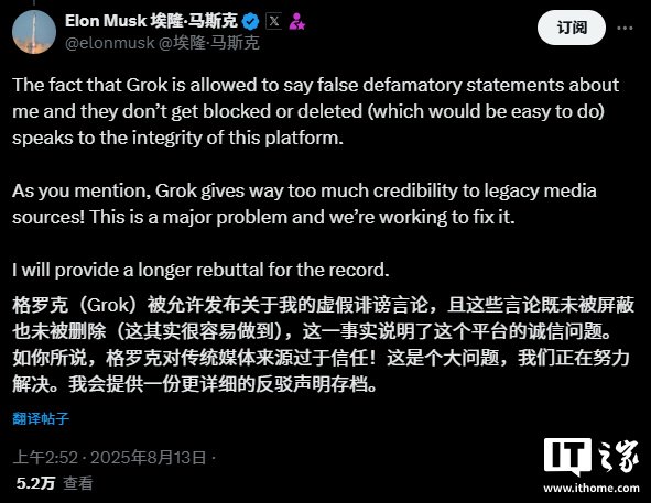 针对 Grok AI 的回复埃隆马斯克称:“Grok AI 可以对我发表虚假的诽谤言论,而且这些言论并没有被屏蔽或删除,这充分说明了这个平台的诚信。Grok 过于相信传统媒体,这是一个大问题,我们正在努力解决问题。”