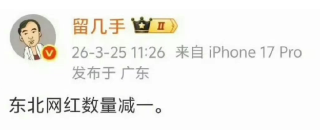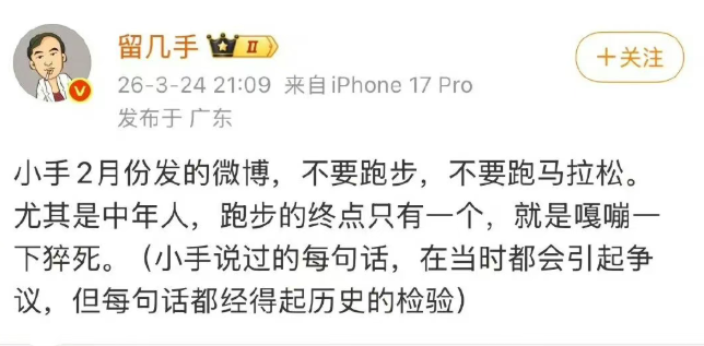 当时,留几手连发三条微博。内容分别为:“东北网红数量减一。”“人不能成为金钱的奴隶,钱没了可以再挣,生命只有一次。”“不要跑步,不要跑马拉松。尤其是中年人,跑步的终点只有一个,就是嘎嘣一下猝死。”
