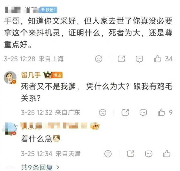 有网友好心劝诫留几手“死者为大,还是尊重点好”,没想到留几手不当回事,甚至嚣张回应:“死者又不是我爹,凭什么为大?跟我有鸡毛关系?”