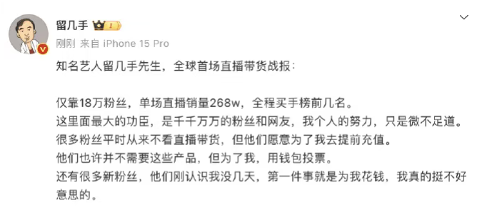 后续,留几手没有继续在抖音开播,而是转移阵地,同年3月在小红书开播带货,喜提268万销售额,还是有不少粉丝支持他的。