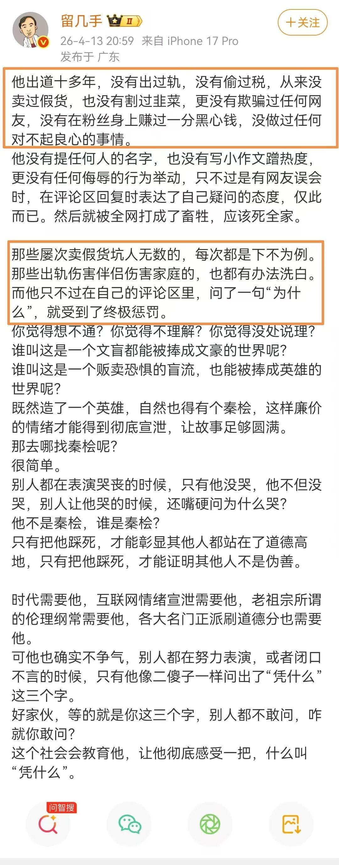 “那些屡次卖假货坑人无数的,每次都是下不为例。那些出轨伤害伴侣伤害家庭的,也都有办法洗白。而他只不过在自己的评论区里,问了一句'为什么',就受到了终极惩罚。”