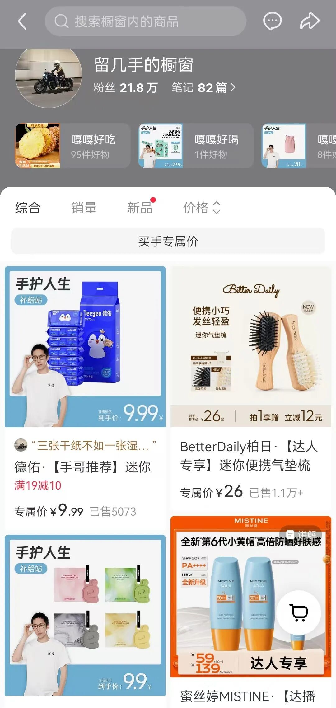 当前,留几手主要在小红书带货,账号粉丝超30万,开设有橱窗,且还在接连不断的上新品,部分商品页面带有留几手的头像。带货种类比较丰富,涵盖吃穿用行等。
