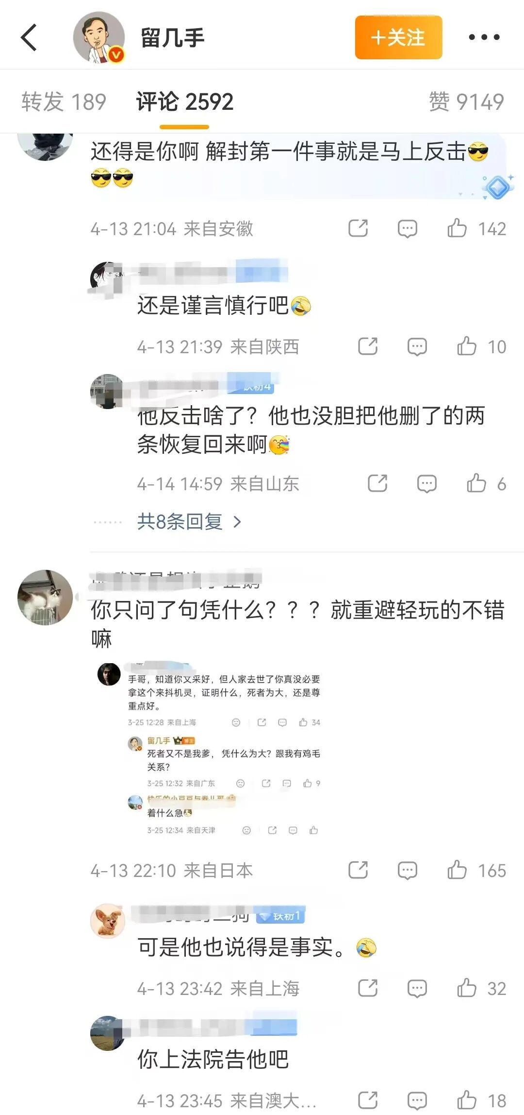 对于留几手的发言,有网友评论“还得是你啊,解封第一件事就是马上反击”;有网友称留几手的解释在“避重就轻”;有网友称“留几手说的是事实”。