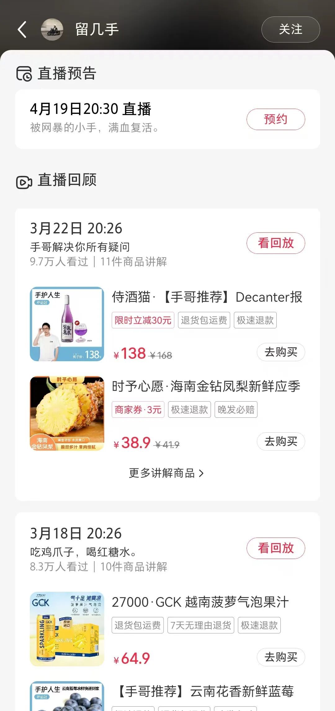 有意思的是,从小红书直播预告中,发现留几手将在4月19日晚上开启直播,主题是“被网暴的小手,满血复活”。看来,在留几手的视角里,他才是受害者。这是留几手解封后的第一次直播,不知道是不是要趁着这波热度,开播带货。